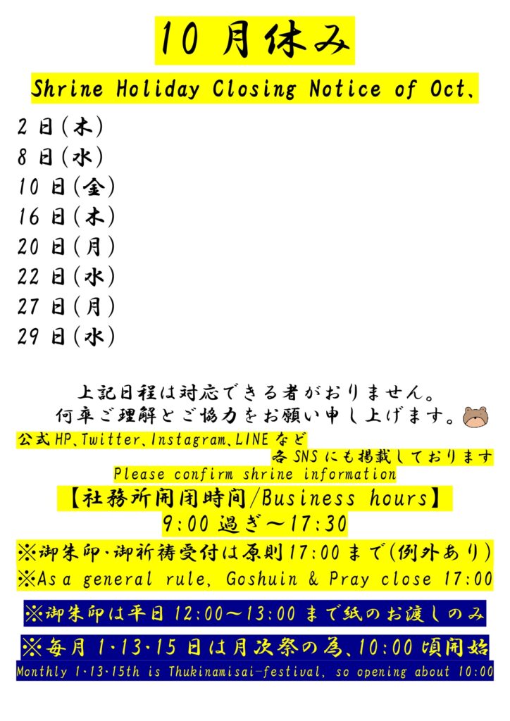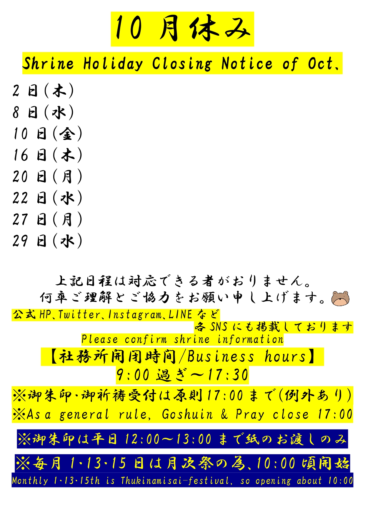 ※毎月1・13・15日は月次祭の為、10:00頃開始